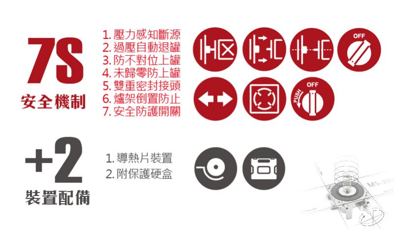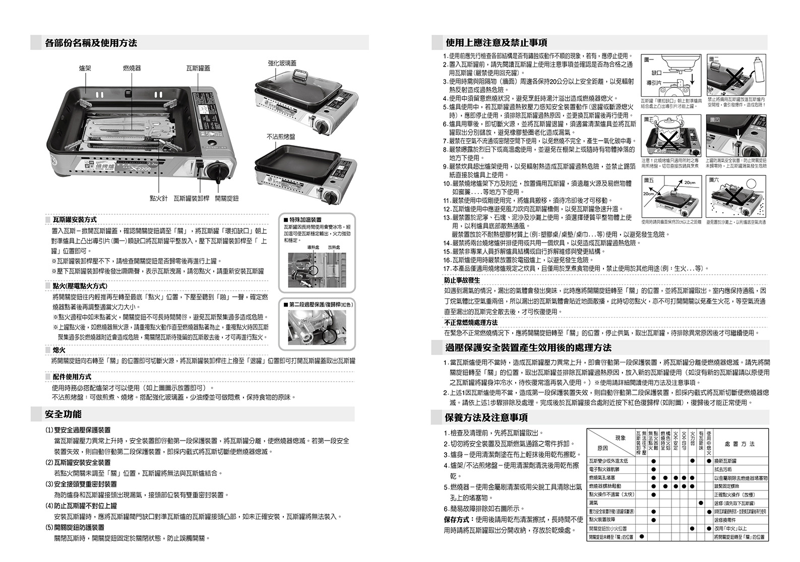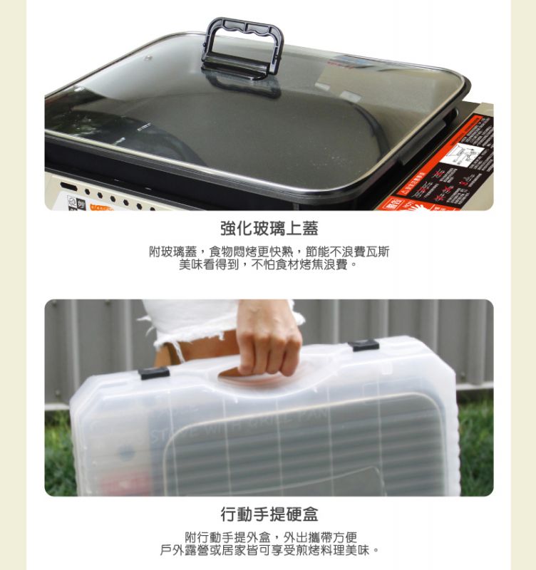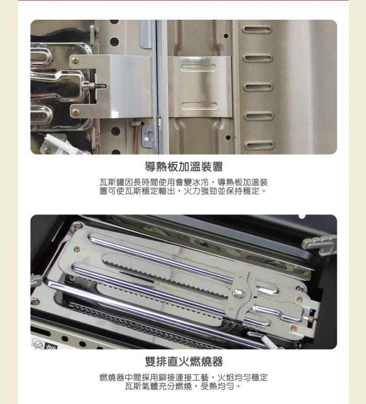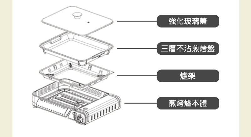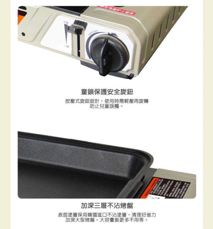 【尺寸】46x33.5x16.5cm±3%(含配件) 【重量】4.57kg±5%(含配件) 【材質】不鏽鋼+鋼板+鋁合金 【燃氣總消耗量】156g/h 【熱功率】2.2KW 【使用燃氣名稱】液化丁烷瓦斯