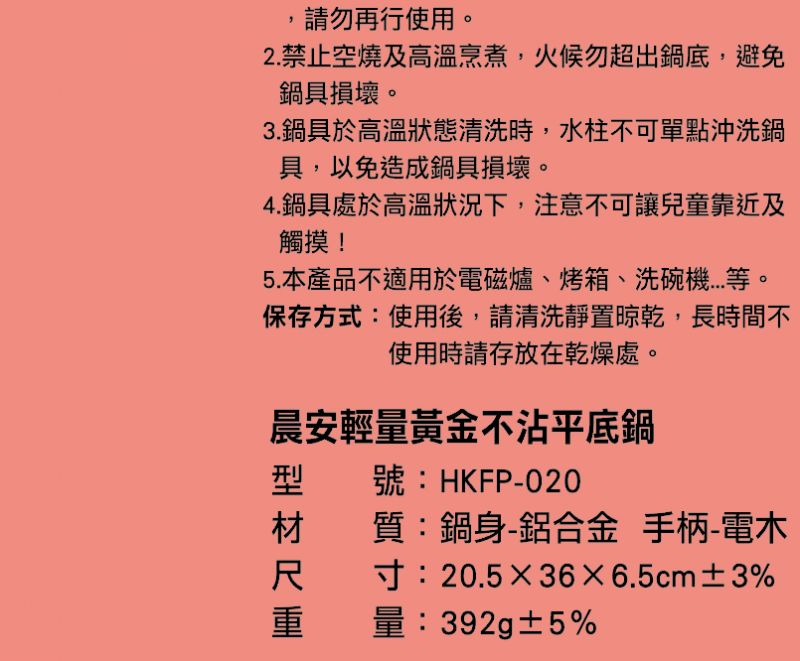 20cm晨安輕量黃金不沾平底鍋